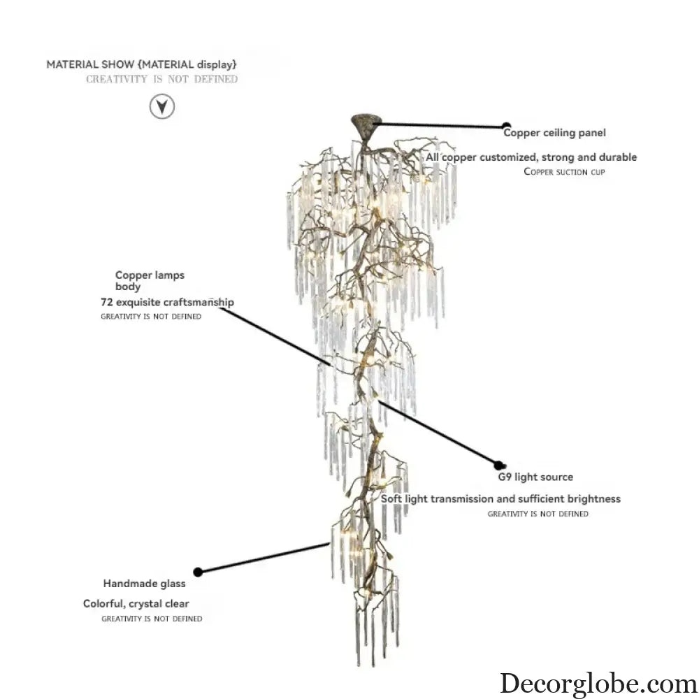 This vintage style crystal pendant chandelier is designed for high ceiling staircases and loft interiors where a bold statement light is needed. Built with a brass branch inspired structure and premium crystal detailing, it creates a rich decorative atmosphere while covering large spaces with layered lighting.