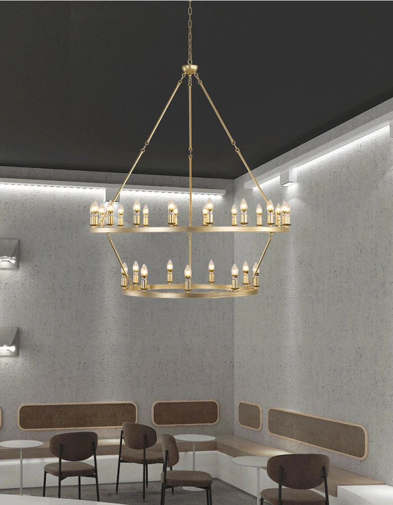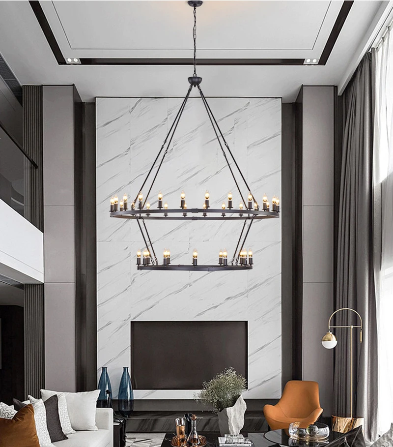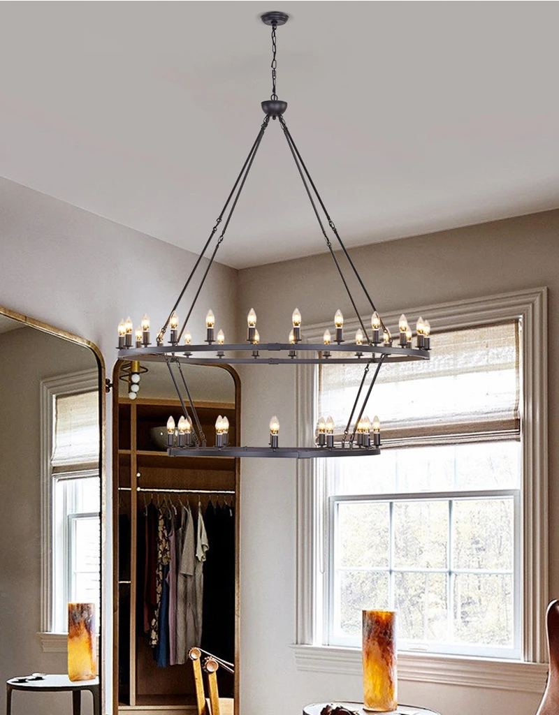 Add a bold statement to your space with this American Wagon Wheel Chandelier. Featuring a retro industrial design with a circular iron frame and candle-style lights, it perfectly suits cafes, restaurants, bars, and stylish living rooms. Its open, shadeless design allows light to spread evenly, creating a warm and inviting ambiance. Compatible with LED bulbs, this chandelier combines functionality with modern rustic elegance.
