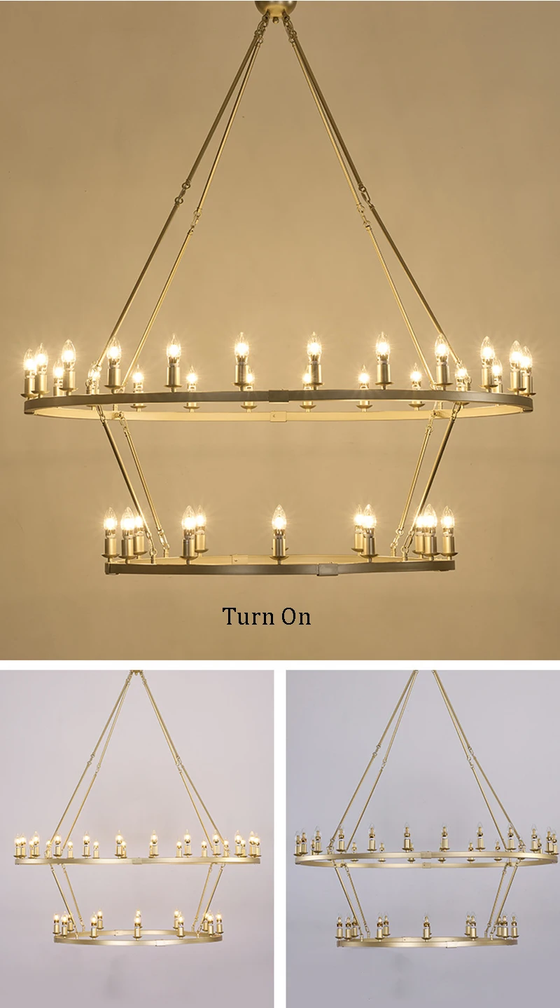 This wagon wheel chandelier adds a rustic touch to any space. Made from wrought iron metal in 2 kinds of finishes ( Black , Gold ) , it features a small circular canopy, linked chain downrod, and diagonal arms suspending a single horizontal circle. 27 -48 piece exposed candle-style bulbs line the circle, bringing an industrial feel and ambient light to your entryway, living room, or dining room. This fixture is height-adjustable, sloped-ceiling, and dimmer-switch compatible. We suggest pairing it with LED 5W bulbs, tube-shaped bulbs (not included).