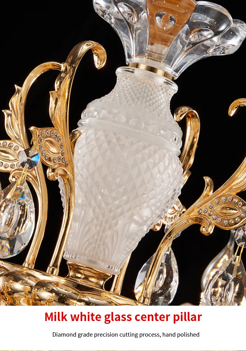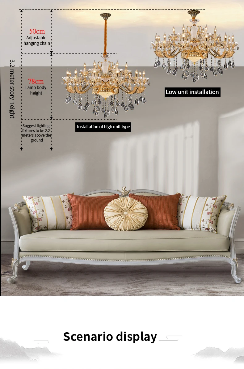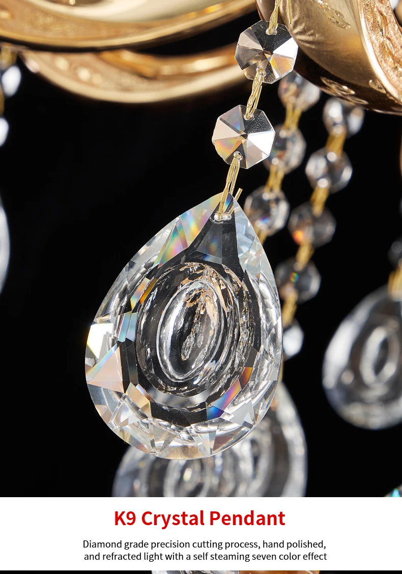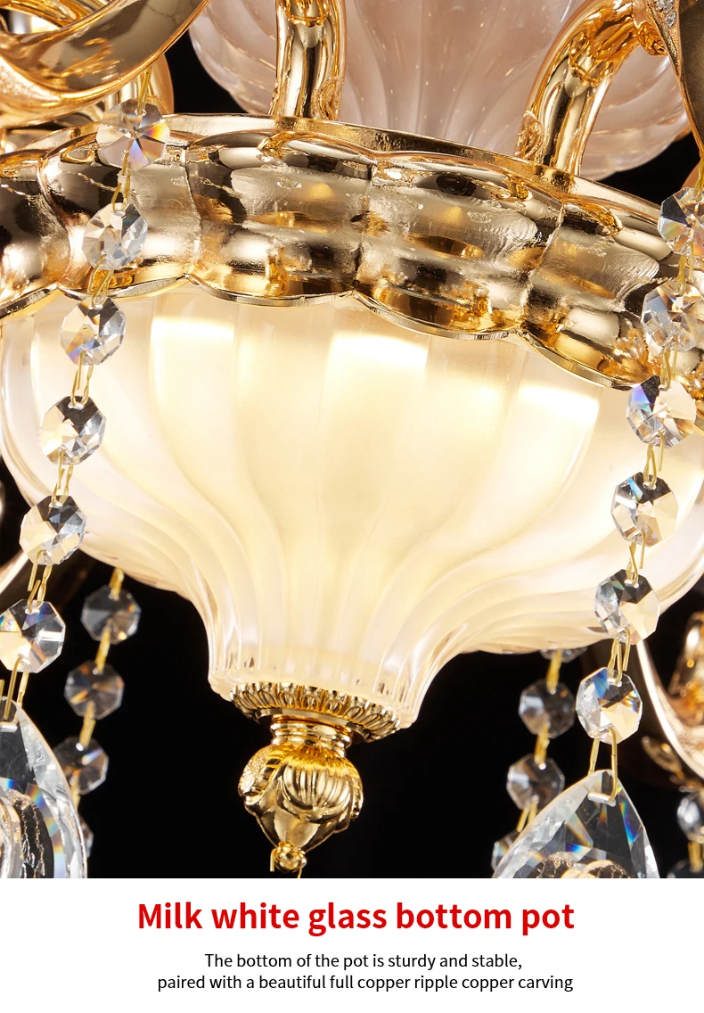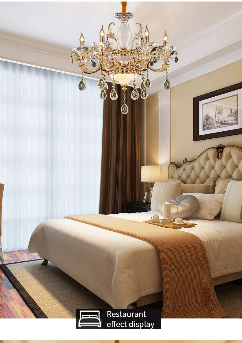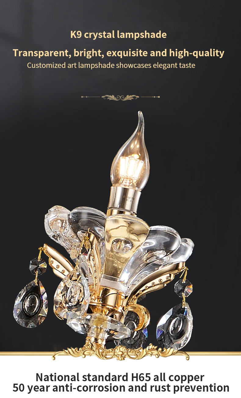 This crystal candle chandelier is designed to create an atmospheric and elegant lighting effect for classic interiors. Made with a polished copper body and crystal shade detailing, it adds a refined decorative touch to living rooms, dining spaces, and bedrooms while delivering balanced up and down lighting.