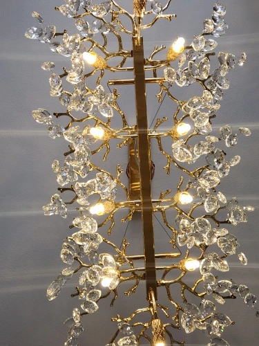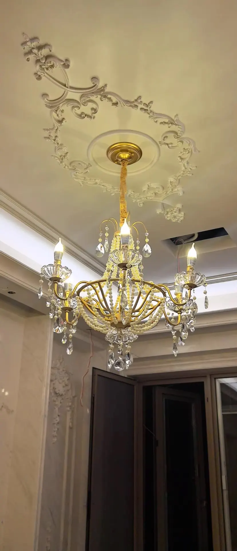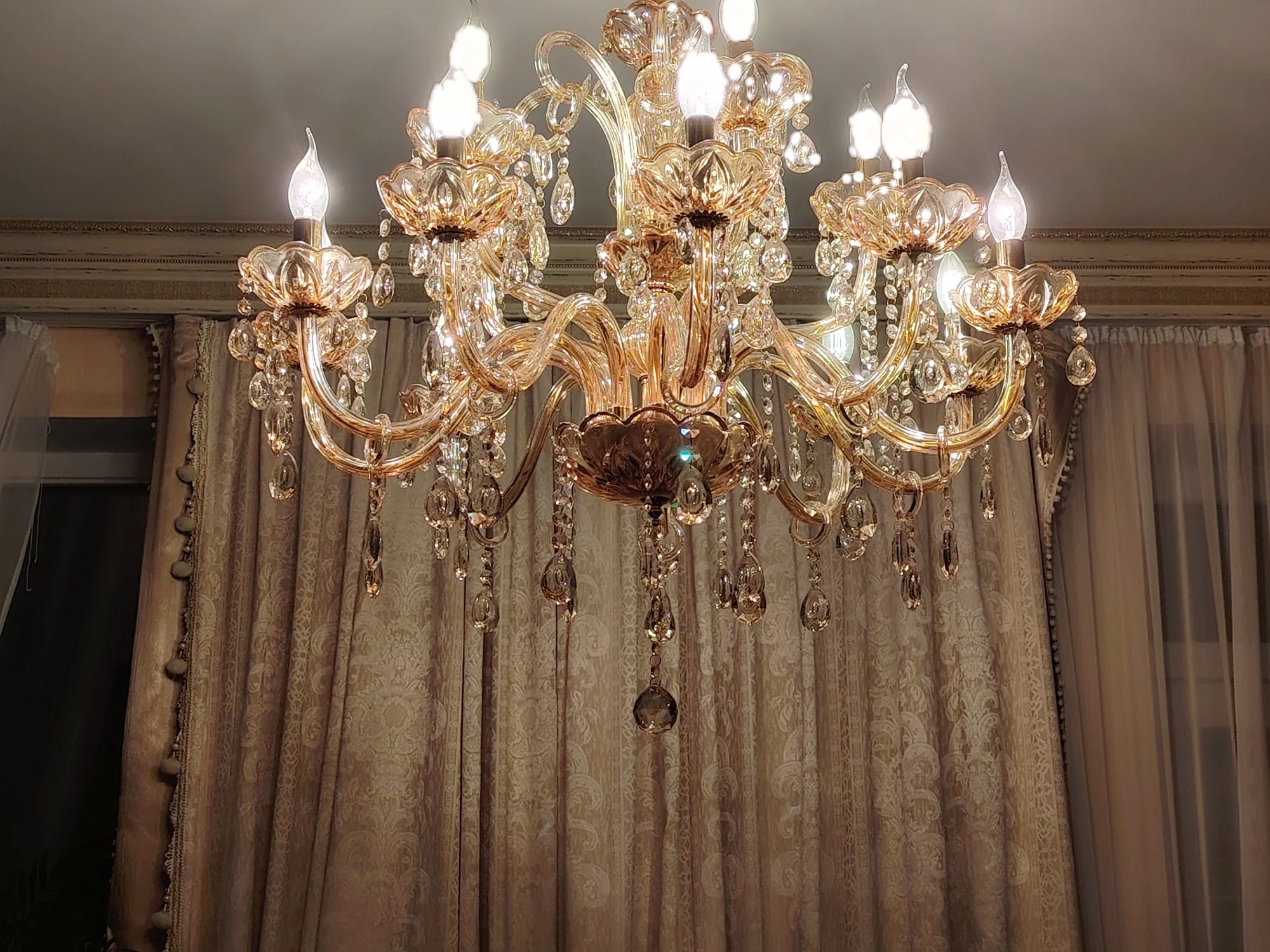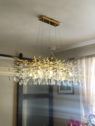 The champagne-colored chandelier looks very elegant, like real crystal. The seller packs all the chandelier parts very well. I have ordered chandeliers from this seller 5 times and everything has always arrived intact. I am very satisfied with the purchase, especially the price!