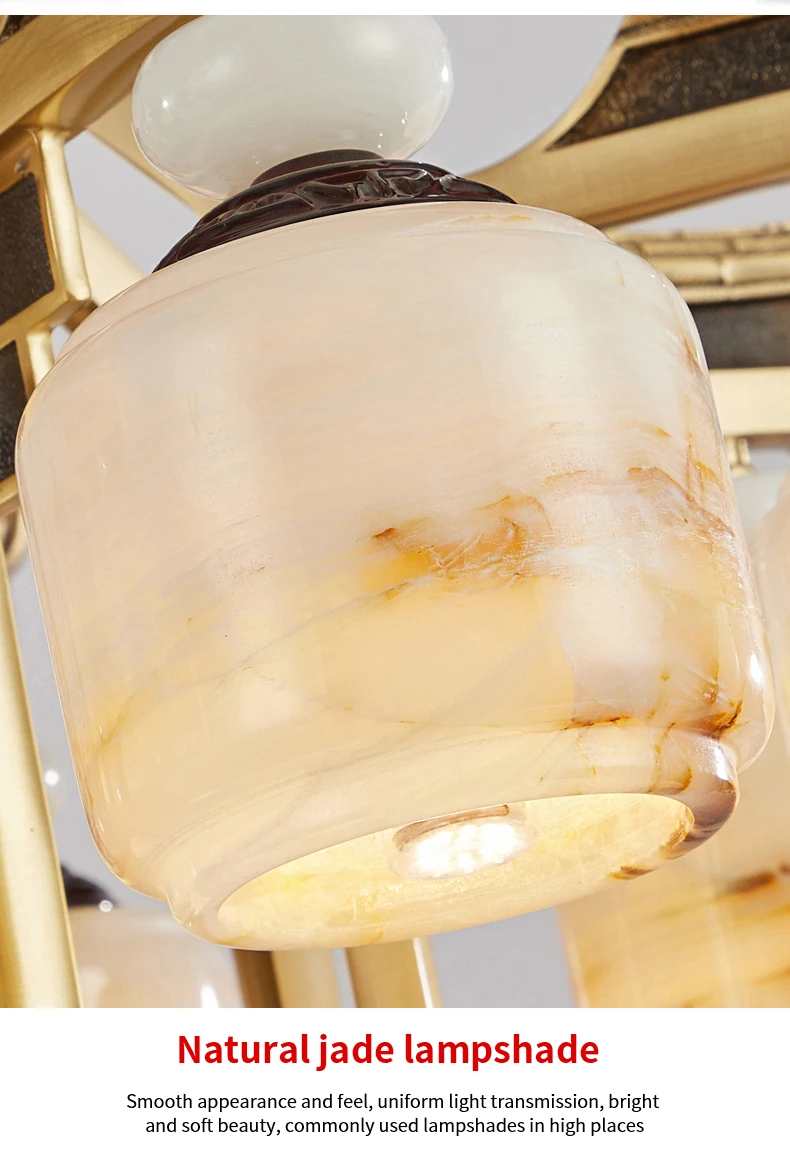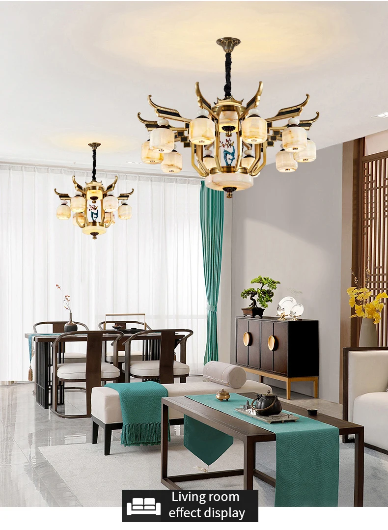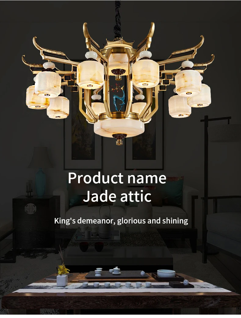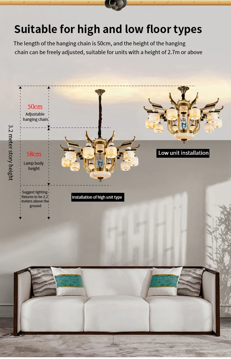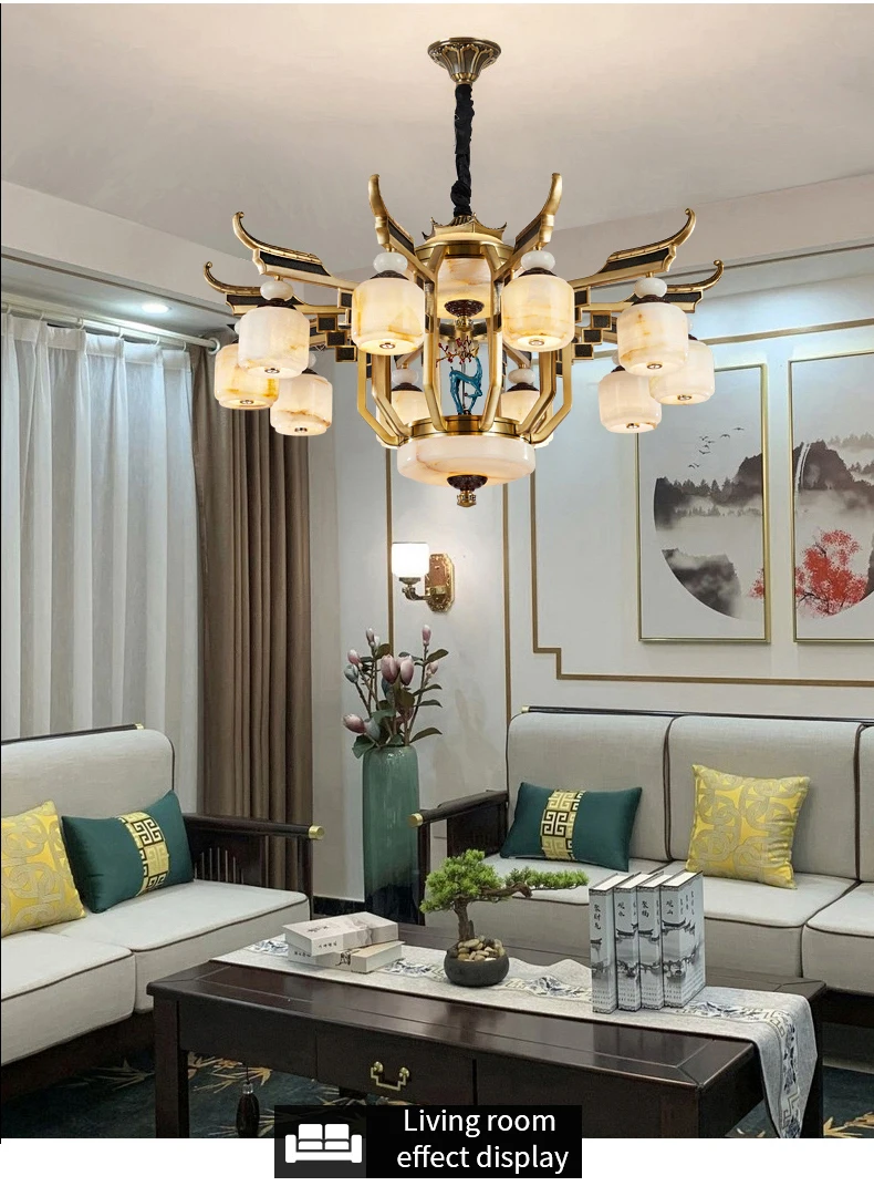 Bring cultural elegance and luxury ambience into your home with this Chinese-style copper and jade-inspired chandelier, designed for villas, duplex interiors, living rooms, and dining areas. Featuring a premium polished copper finish with refined white marble elements, this chandelier creates a warm, atmospheric glow while serving as a striking centerpiece for high-end interior décor.
