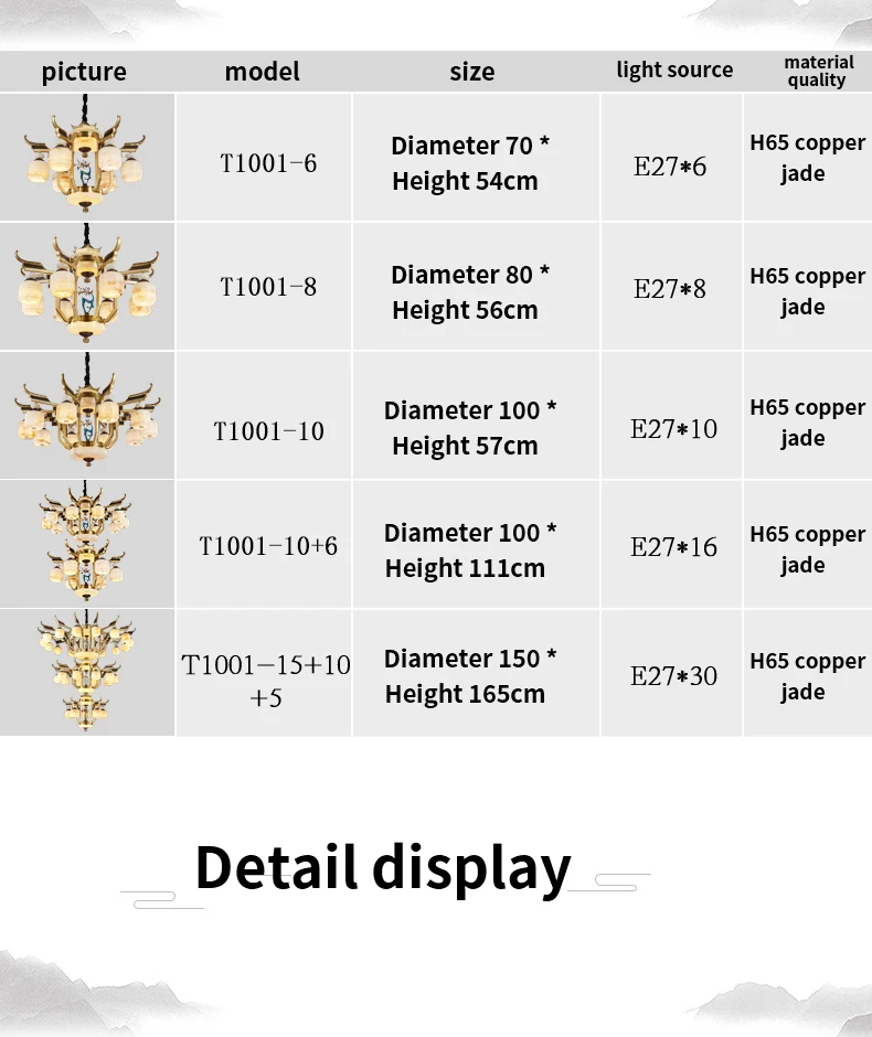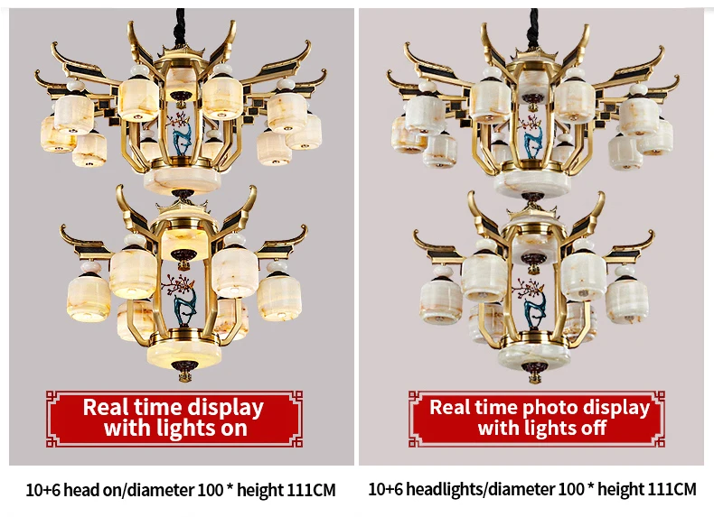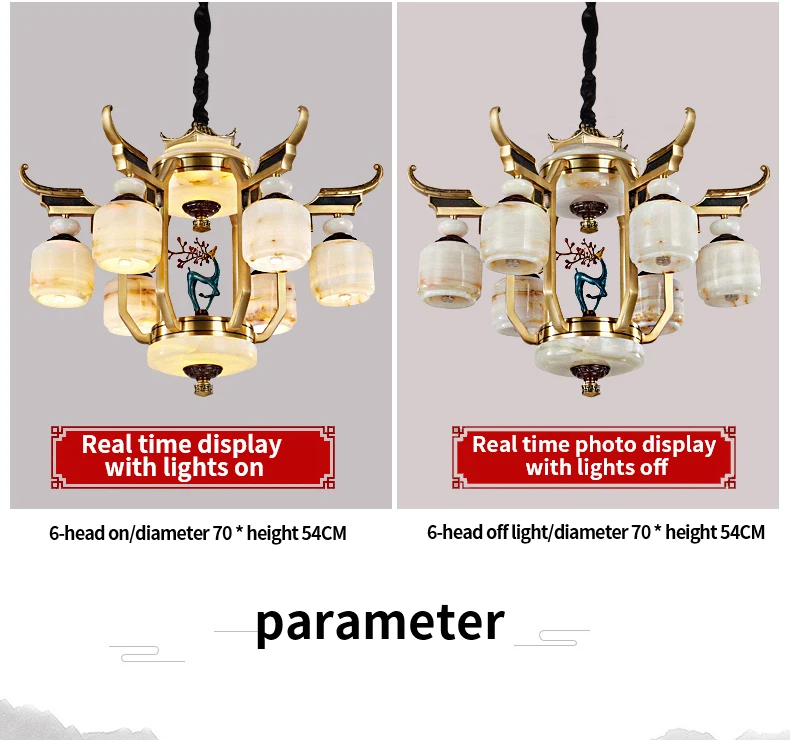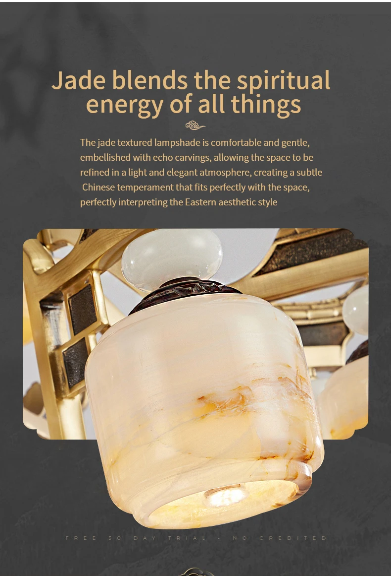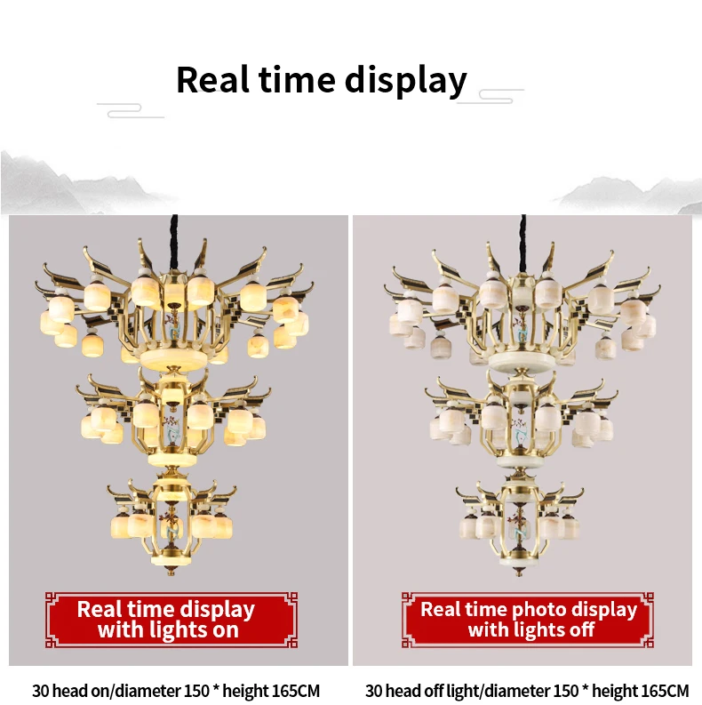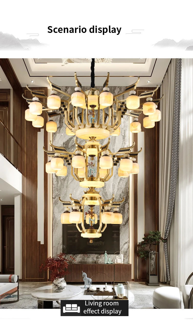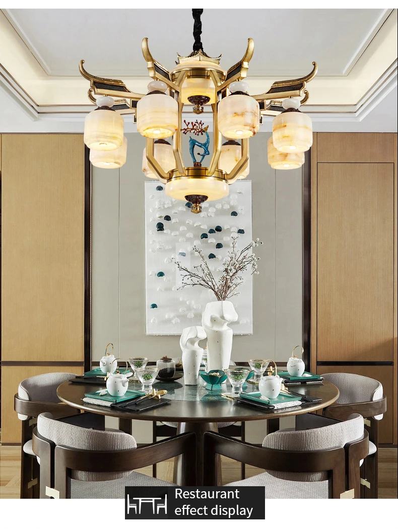 Bring cultural elegance and luxury ambience into your home with this Chinese-style copper and jade-inspired chandelier, designed for villas, duplex interiors, living rooms, and dining areas. Featuring a premium polished copper finish with refined white marble elements, this chandelier creates a warm, atmospheric glow while serving as a striking centerpiece for high-end interior décor.