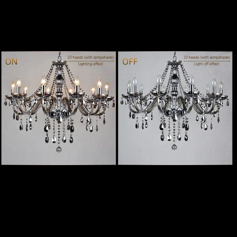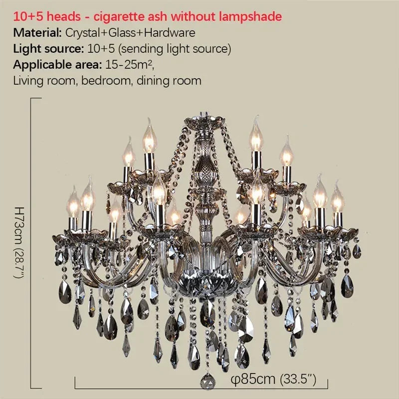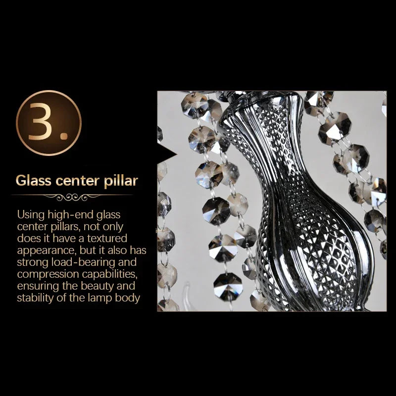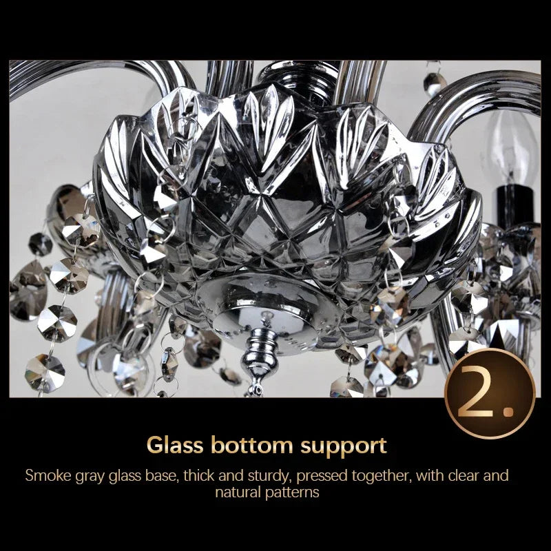 This European Crystal Chandelier captures timeless elegance through its refined smoke-toned crystal composition and balanced multi-arm structure. The sculpted central column flows into gracefully curved arms, each supporting candle-style lights that emit a warm upward glow.